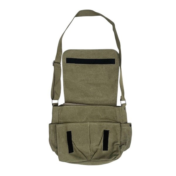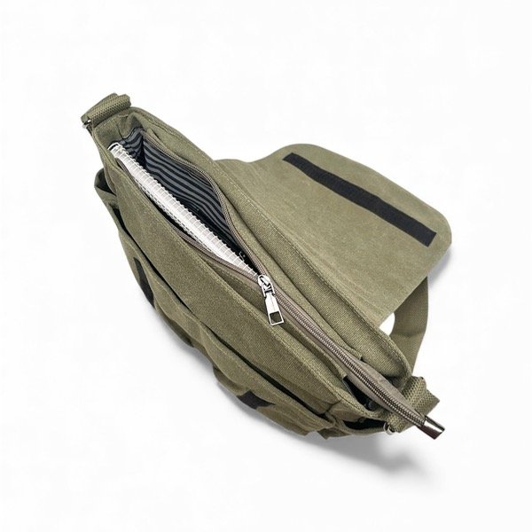 Compartimientos: 5 y 2 bolsillos laterales. El compartimiento principal es amplio, cuenta con un cierre y una tapa con abrojo. Además tiene un bolsillo interior con cierre y otro sin cierre. Los bolsillos laterales poseen un cierre con botón a presión.